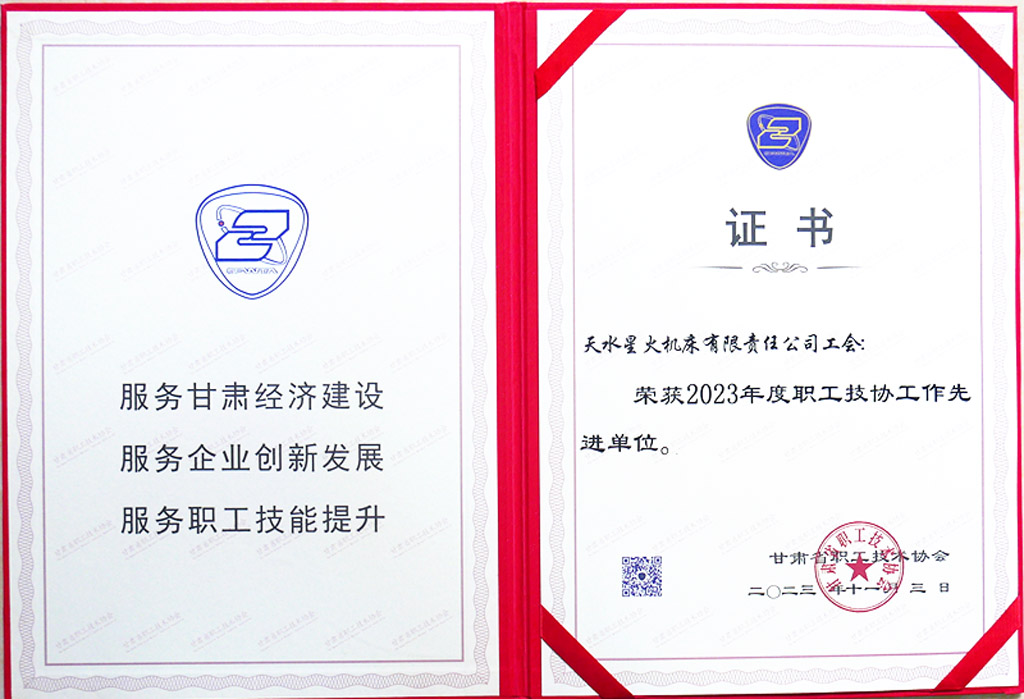 近日,甘肃省职工技术协会表彰全省职工技协先进,星火机床公司工会荣获“2023年度职工技协工作先进单位”,工会副主席蔡建欣荣获“2023年度职工技协工作先进个人”称号。